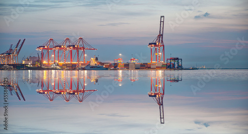 Container terminal in industrial port with cranes - Ship loading in port with busy port at night - Mersin, Turkey