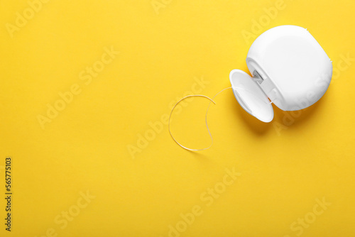 Container with dental floss on yellow background, top view. Space for text