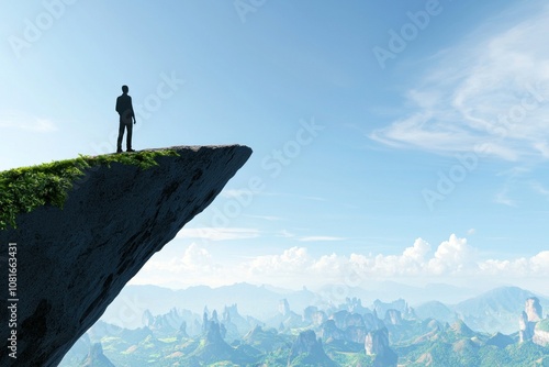 Contemplative figure overlooking majestic landscape remote mountain peak photography scenic nature wide angle inspiration