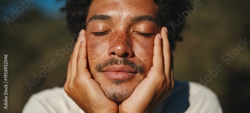 Contemplative Man with Closed Eyes, Hands on Face, in a Natural Setting