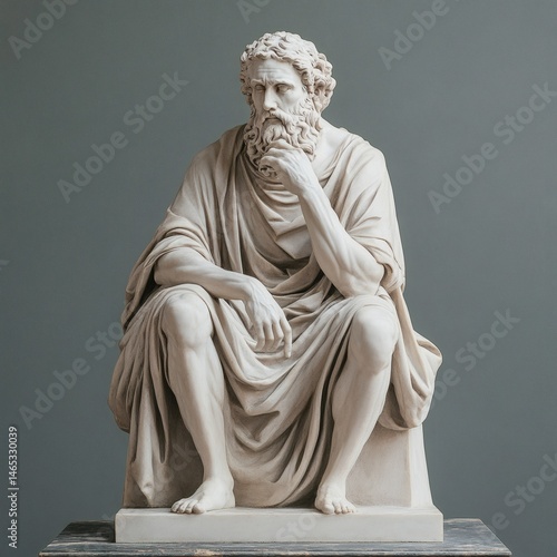 Contemplative Stone Figure: A classic stone sculpture of a seated man engrossed in deep thought, capturing the essence of wisdom and reflection.