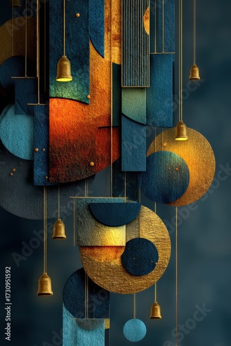 Contemporary abstract art with geometric shapes and gold accents in blue hues