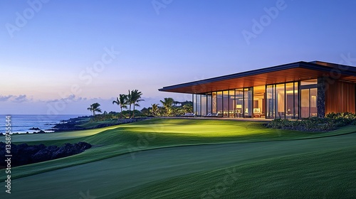 Contemporary clubhouse nestled on a golf course beside the ocean sleek wooden accents large windows, and soft evening glow.