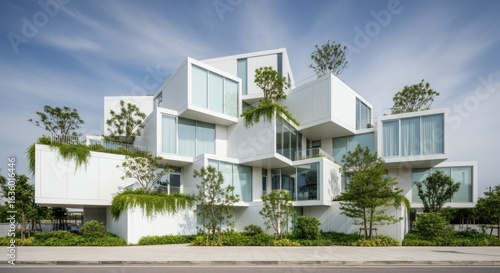 Contemporary deconstructed architecture featuring white cubic volumes, large windows, and lush greenery.