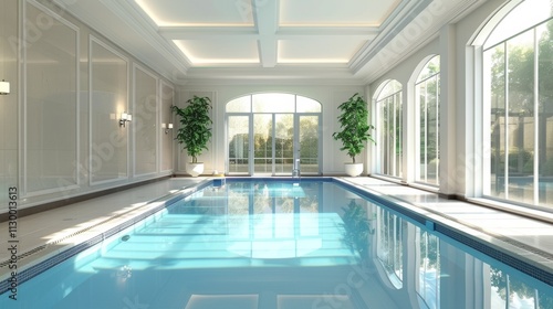 Contemporary indoor swimming pool with a sleek, open layout and sunlight streaming in through large windows