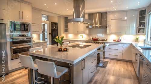 Contemporary kitchen featuring glossy white cabinetry, a large quartz island, and sleek stainless steel appliances