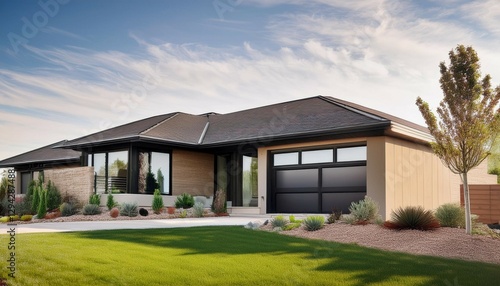 contemporary suburban home with a bold architectural design featuring sharp angles a flat roof and a front yard with an eco friendly xeriscape