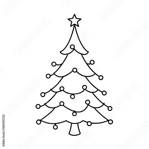 Continuous line art drawing a decorated pine tree with a star christmas decoration