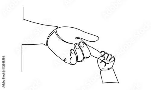 Continuous line drawing of Close-up little hand of child baby holding hand of father, Baby holding mother's finger at home. The newborn baby has a firm grip on the parent's finger after birth.