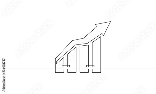 Continuous one line drawing of graph. Increasing arrow up icon. Illustration vector of business growth. Single line art of bar chart