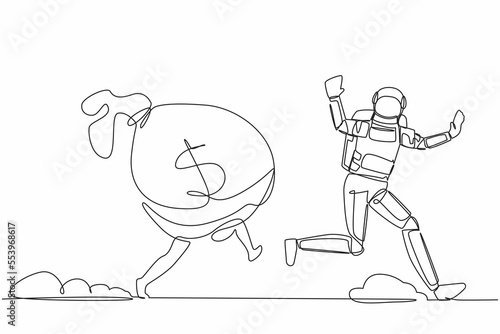 Continuous one line drawing of young astronaut being chased by money bag. Hurry in achieving wealth and profit goals in spaceship company. Cosmonaut outer space. Single line design vector illustration
