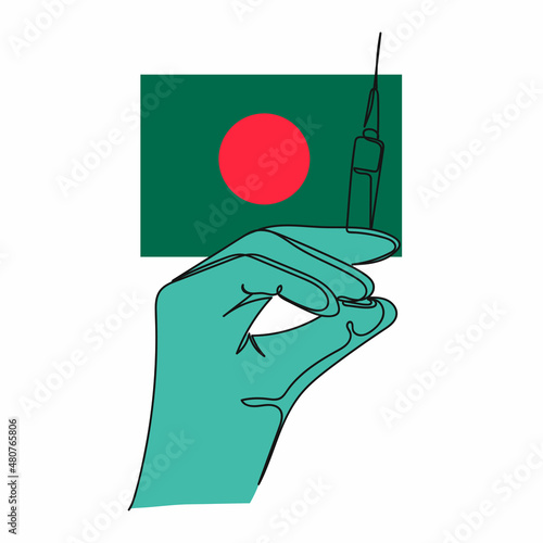 Continuous one simple single abstract line drawing of hand holding vaccine vaccination in Bangladesh icon in silhouette on a white background. Linear stylized.