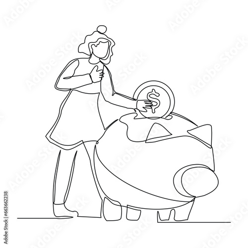 Continuous single line sketch drawing of business woman save coin in piggy bank. Vector illustration of one line money investment financial economy