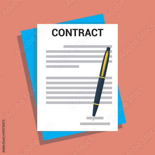 Contract papers. Document. Folder with text. Stack of agreements document with Contract icon agreement pen on desk flat business illustration vector'