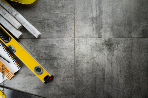 Contractor theme. Plans, tool kit of the contractor, yellow hardhat and libella. Gray tiles background.