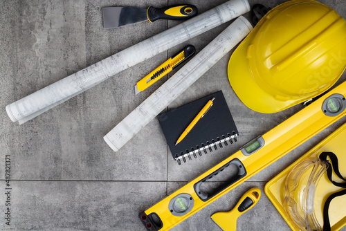 Contractor theme. Tool kit of the contractor: yellow hardhat, libella, hand saw. Plans and notebook on the gray tiles.