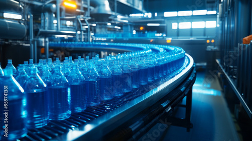 Conveyor belt with juice bottles in a blue-toned beverage factory.