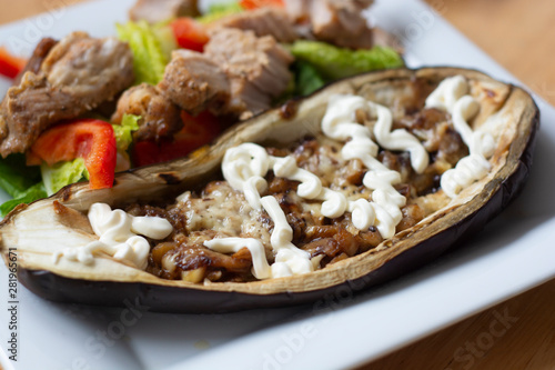 Cooked, baked eggplant stuffed with cheese, nuts, and yogurt dressing with fresh salad, in white plate. Healthy food.