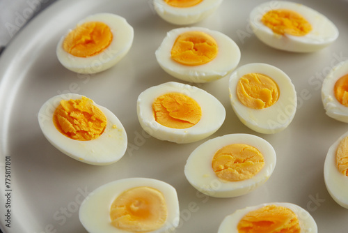 Cooked Hard Boiled Eggs on a Plate, side view.