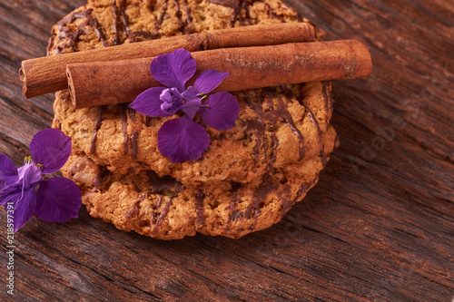 cookies and spring blue flowers Healthy morning breakfast concept. Minimalist. selective focus