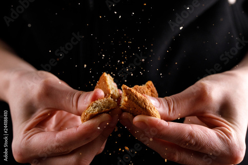 Cookies breaking in the hands on a black background. Close-up.