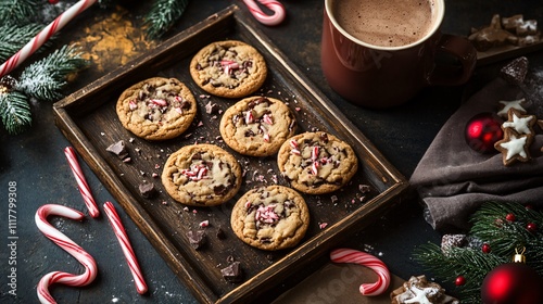 Cookies on a rustic tray, surrounded by fresh peppermint leaves, candy cane sticks, and a mug of steaming hot chocolate