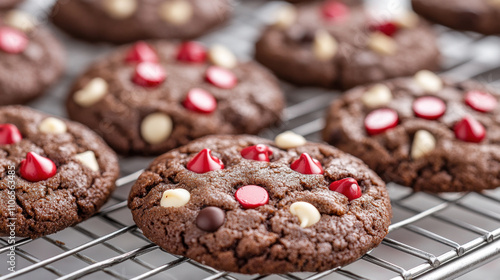 Cookies red chocolate candy chips on a cooling rack