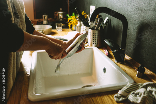 Cooking a fresh gilthead seabream with lemon, garlic and herbs, covered with salt