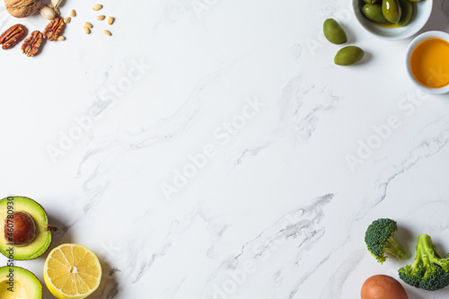 Cooking background. Healthy diet ingredients frame on white marble, copy space.