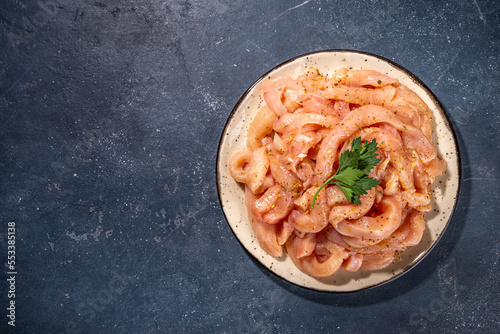Cooking diet white poultry meat background. Fresh sliced chicken strips raw for cooking, with spices, herbs, on a black concrete background top view copy space