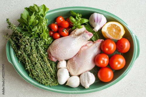 Cooking Ingredients with Chicken, Garlic, and Tomatoes