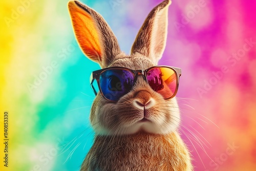 Cool bunny with sunglasses on colorful background. Generative Ai