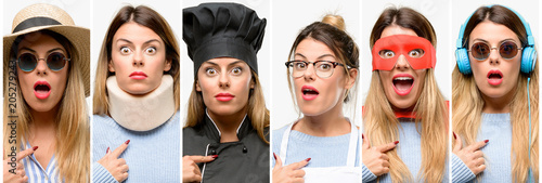 Cool woman, different professions happy and surprised cheering expressing wow gesture, pointing with finger