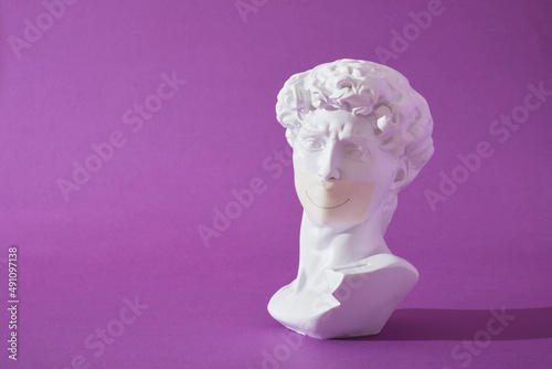 copy of head of antique statue of David with sealed mouth purple background, trendy colors, smile painted on tape