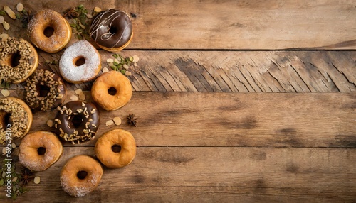 Copy Space image of Variety of donuts over a rustic background shot from overhead