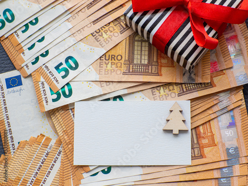 Copy space with christmas tree on the background of fifty euros banknotes with gift box. Set of European Union money. Enterprise capital investment, finance, savings, Christmas and New Year concept.
