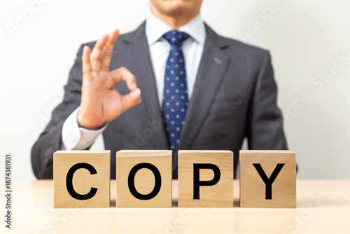「COPY」と書かれたブロックとOKポーズをするビジネスマン