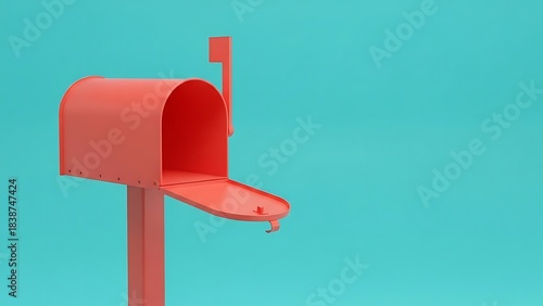 Coral Red Mailbox with Open Door and Flag Against Turquoise Blue Background image