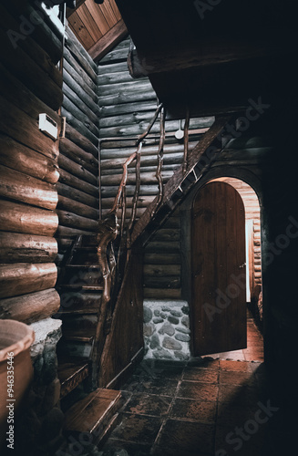 CORDOBA, ARGENTINA, MAY 4, 2022: Mysterious view of wooden cabin with a door letting light passing through