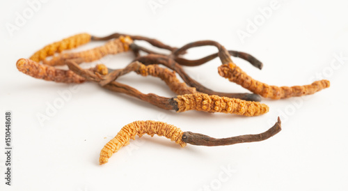 Cordyceps or Ophiocordyceps sinensis mushroom herb is fungus on white background.