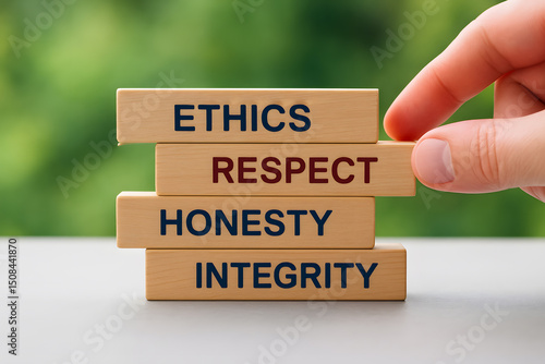 Core Business Values Like Ethics, Respect, Honesty and Integrity Displayed on Wooden Blocks for Professional Ethics