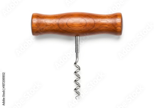 Corkscrew tool featuring a polished wooden handle and metal spiral design is isolated against white