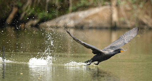 Cormorant taking flight from lake