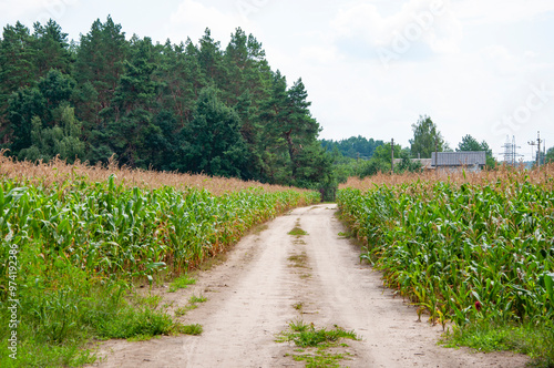 Corn crop. Maize harvest farming. Countryside road in maize field. Corn crop harvest village. Road way in village field of corn. Maize crop harvest. Agriculture and harvesting in farm. Maize fields