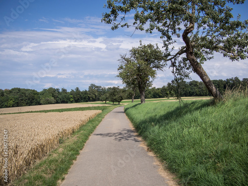 Corn field on a road in autumn with a cloudy sky in front of a wooded hill