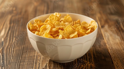 Corn flakes in a white bowl on wood surface