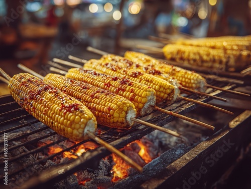 Corn on the cob grilled over open flame on skewers at a rustic outdoor barbecue du daytime