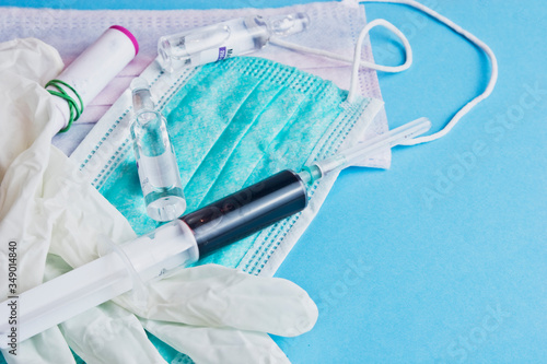 Coronavirus vaccine. Mass vaccination of the population. Tests for coronavirus. Medical gloves and protective masks close-up. Coronavirus control methods in the world