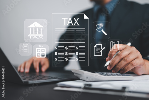 Corporate and individual tax payment concept, businessman using computer filling out corporate and personal income tax return, VAT and property tax of business.
