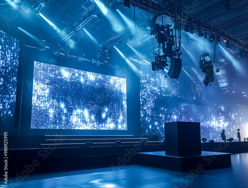 Corporate event stage with immersive lighting effects and a digital backdrop
